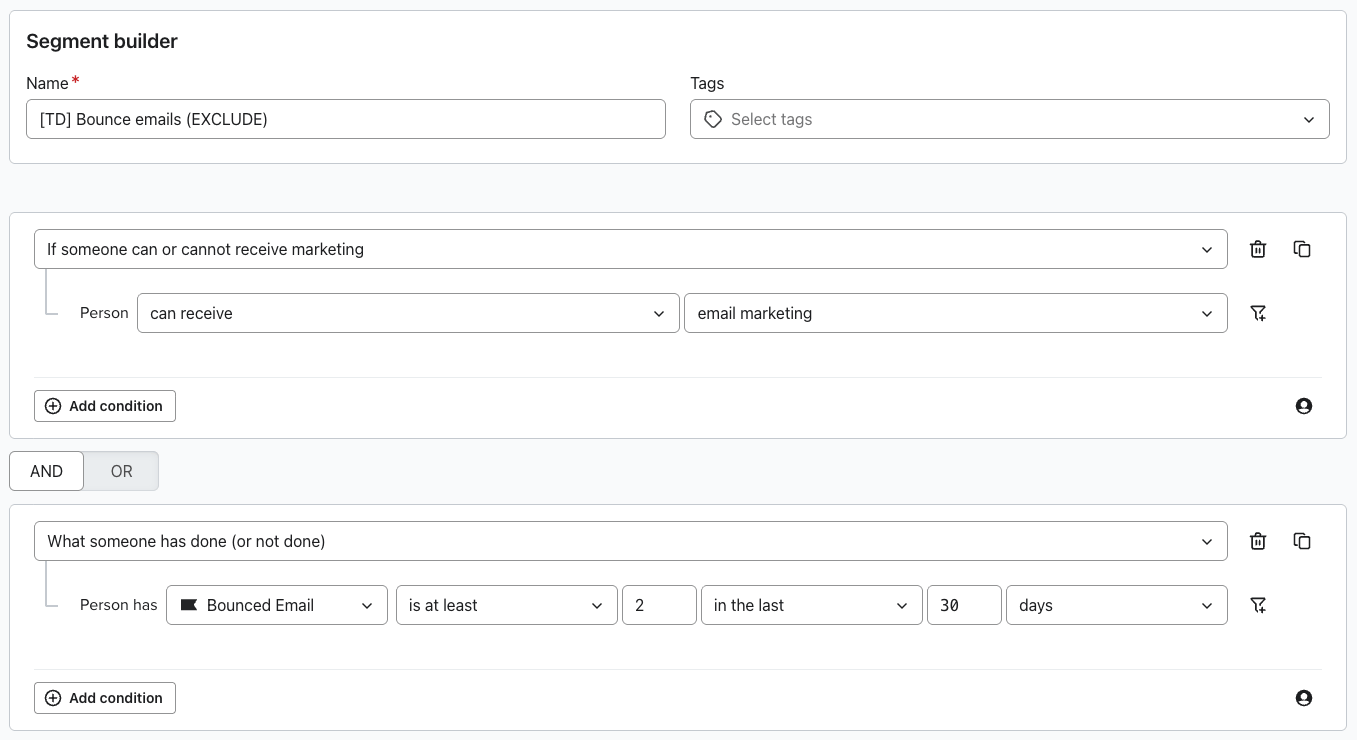 Every platform is different, but in Klaviyo, a profile has to bounce SEVEN times before it’s suppressed. Avoid the bounces and exclude the segment below from most all campaigns.