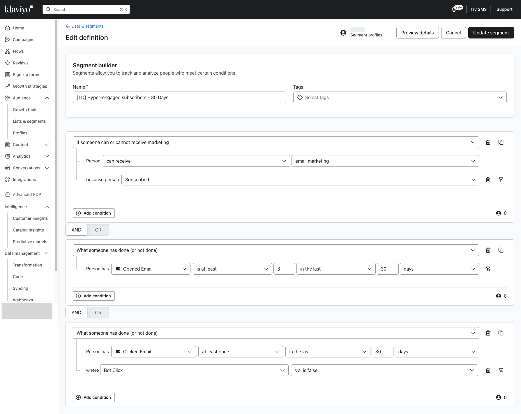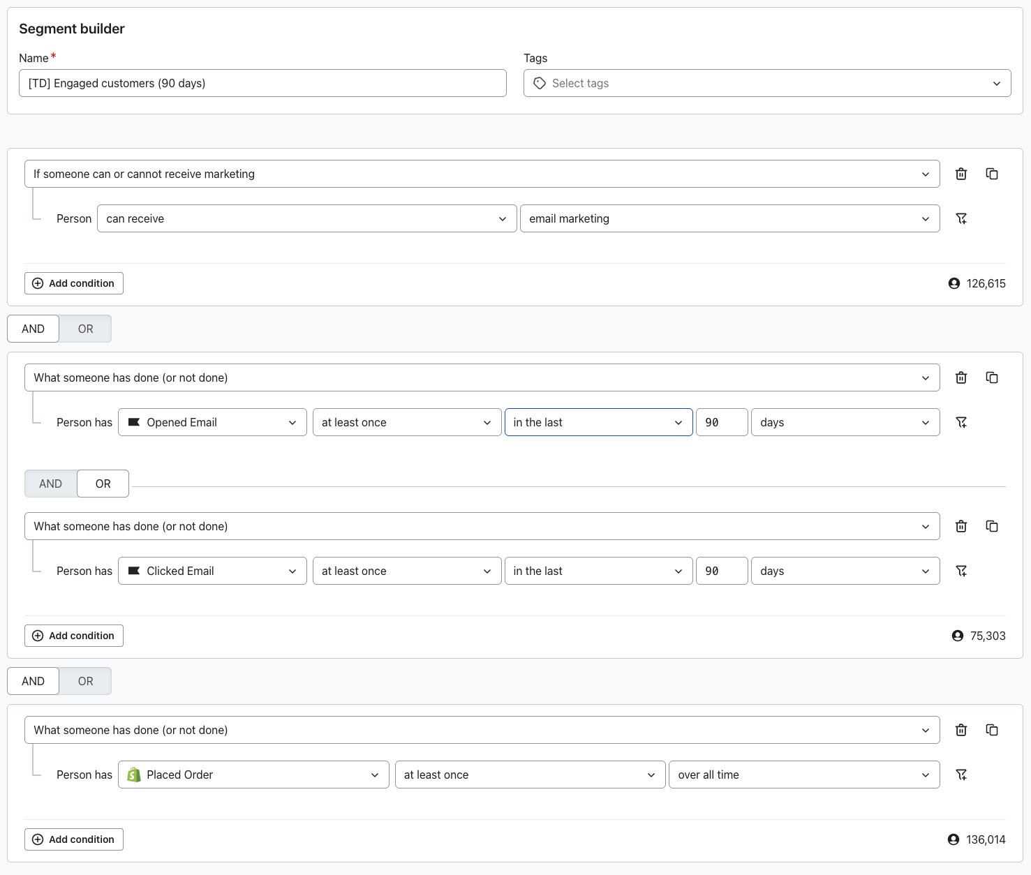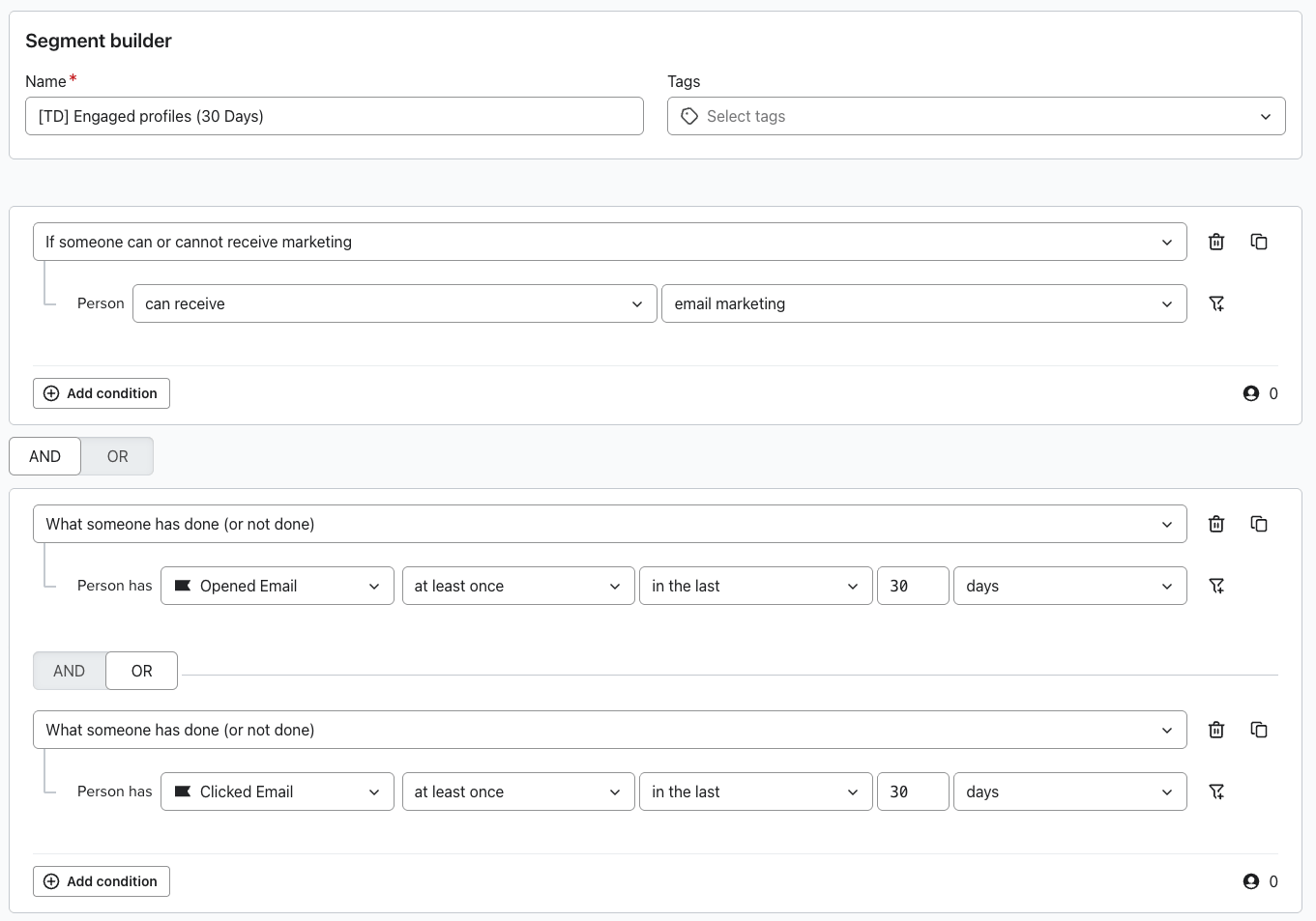 In the general “Engaged profiles“ segment below, you see we only want to include profiles who can receive email marketing and HAVE opened or clicked in the last X days.
