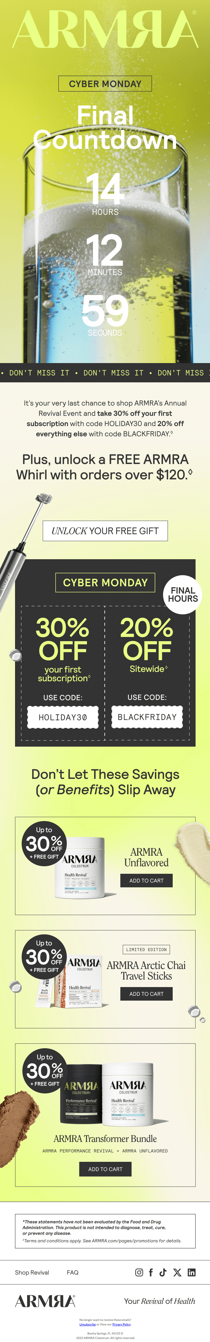 ARMRA’s Cyber Monday email is aggressive, but structured. It’s event-first, not discount-first in the hero…