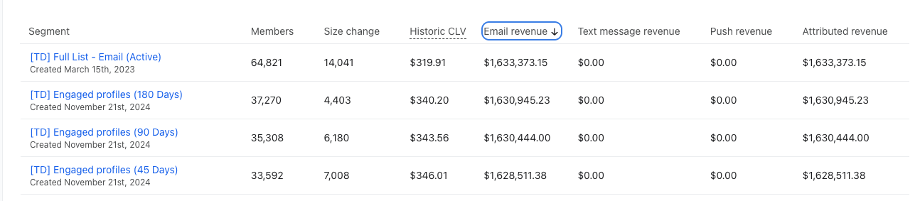 Your engaged 30 to 45 day segment is your revenue segment. This is where the overwhelming majority of your attributed email revenue comes from and the data above proves it. Every promotional campaign, every launch, every time-sensitive offer goes here first.