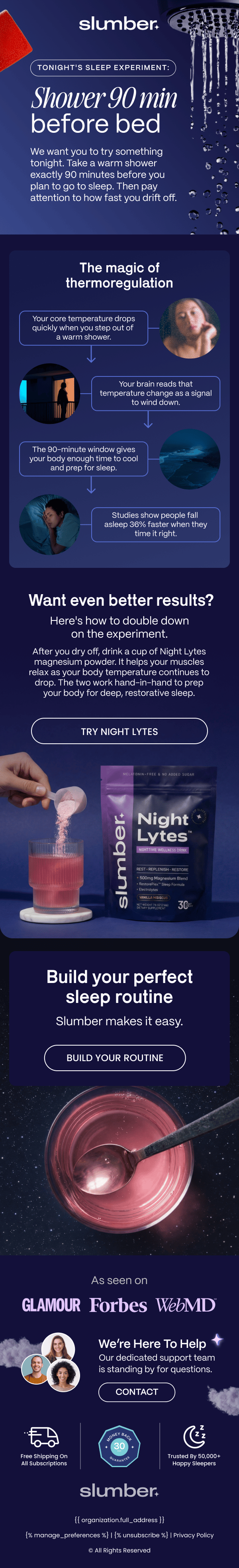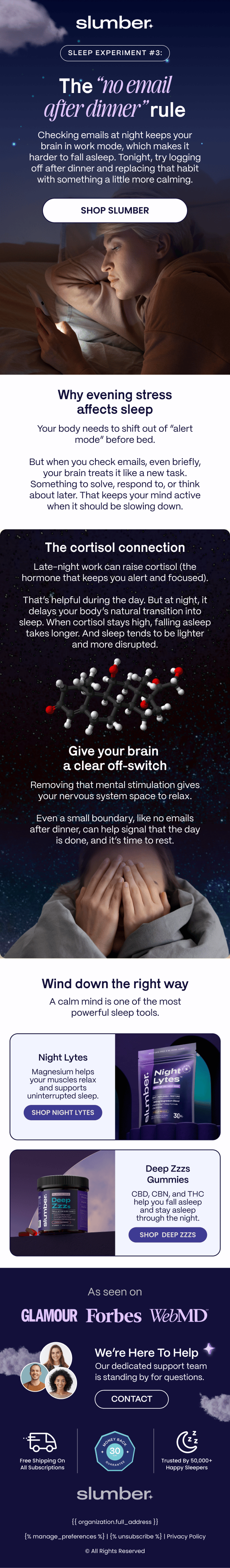 Their sleep experiment emails give customers small behavioral changes to test, like when to shower, the best and worst times to use your phone, breathing techniques to try that support winding down, and more.
