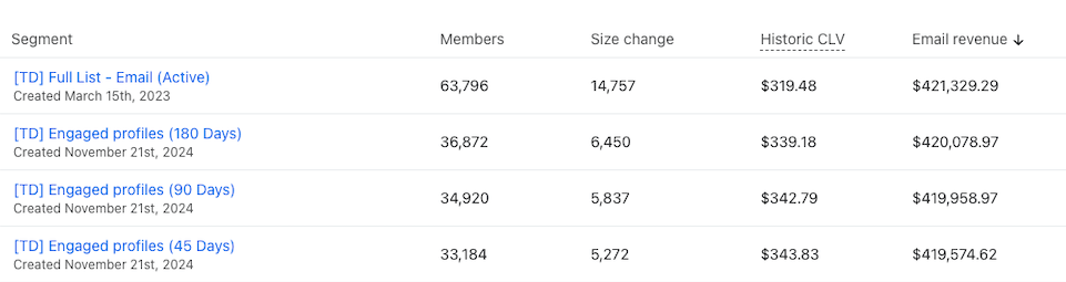 Takeaway? Stop sending to your full list. You’re ruining engagement and making almost no incremental revenue.